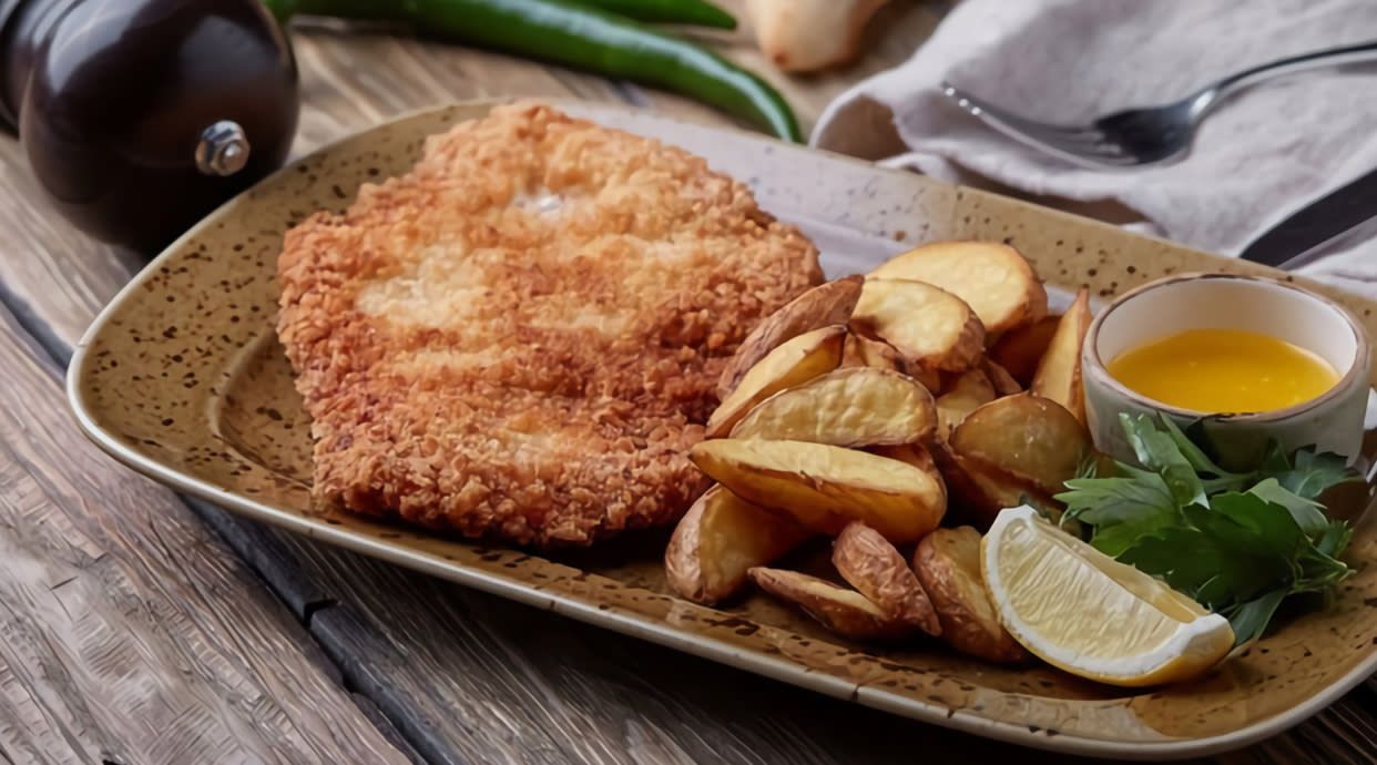 Sabrosas tiras de solomillo de pollo, patatas y la salsa de tu preferencia