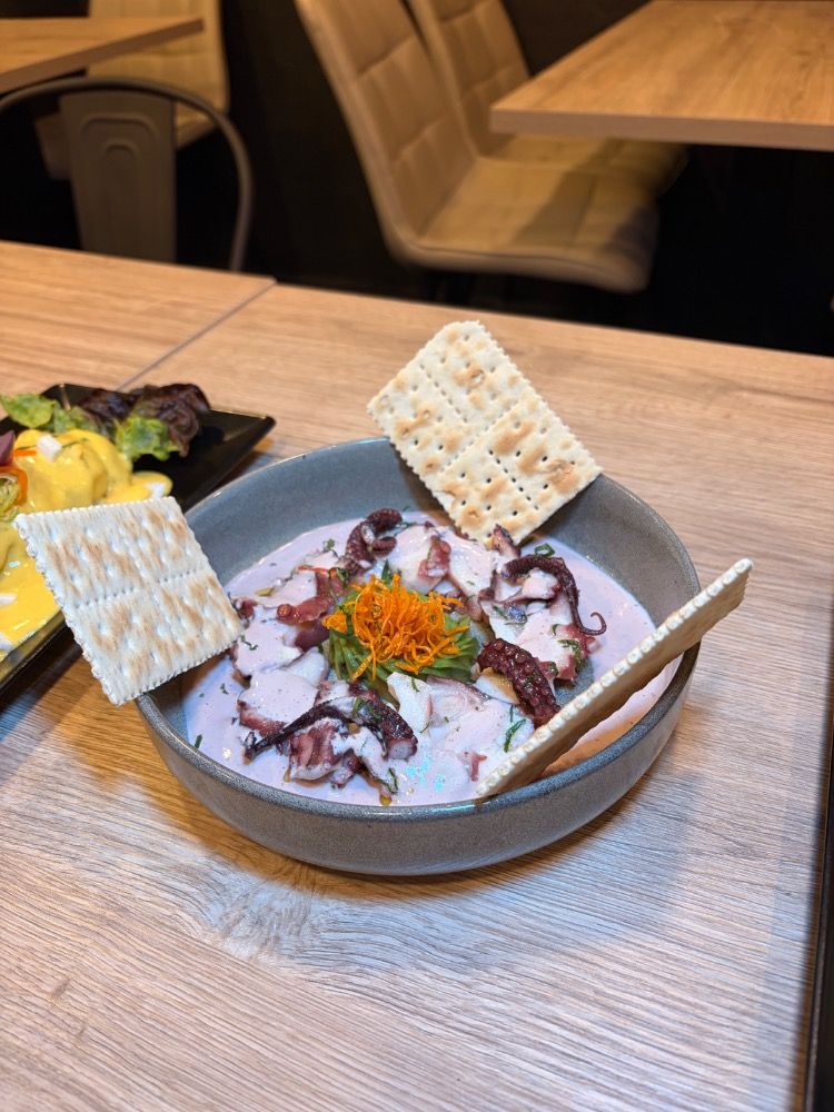 Laminas de pulpo insusionado en leche de tigre, salsa de olivo y aguacate gratinado, acompañado de galletos clásicas.