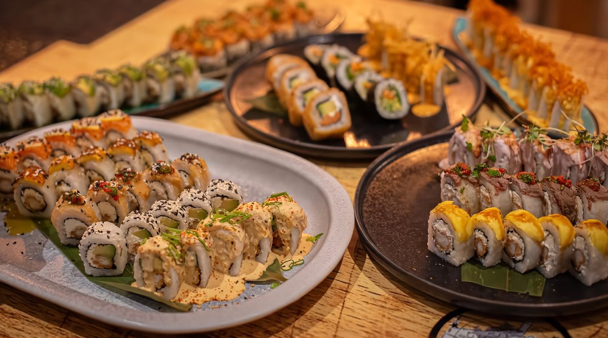 Relleno de langostino furai y queso crema. Cubierto de láminas de aguacate, bañada en salsa taré (salsa dulce)