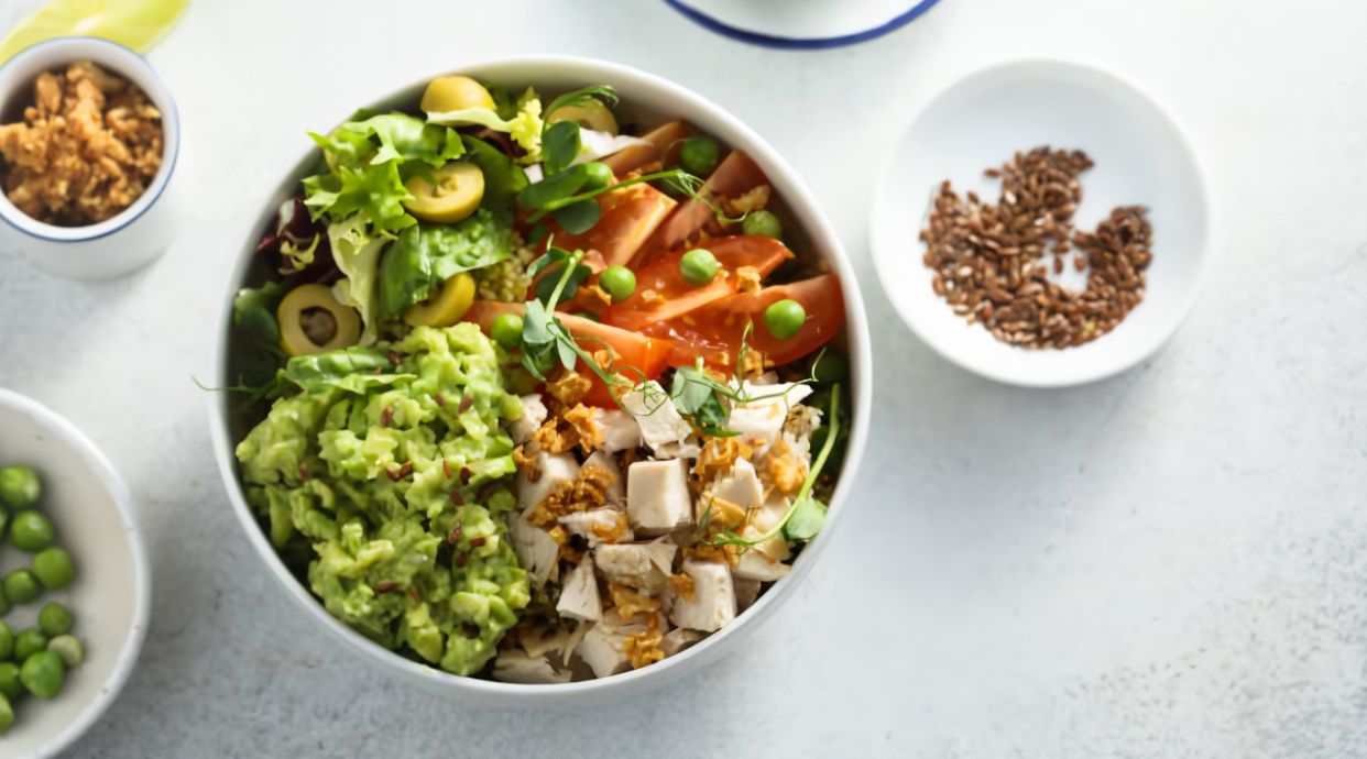 Pollo marinado al pesto de albahaca, queso curado, manzana, wakame, tomate eco, mayo japo y toque final de semillas de calabaza