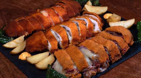 Si eres fan del pollo este es tu kachopo, relleno de bacon, boletus y doble de queso edam. Peso aproximado 300 g. Acompañado de patatas fritas y pimientos de padrón