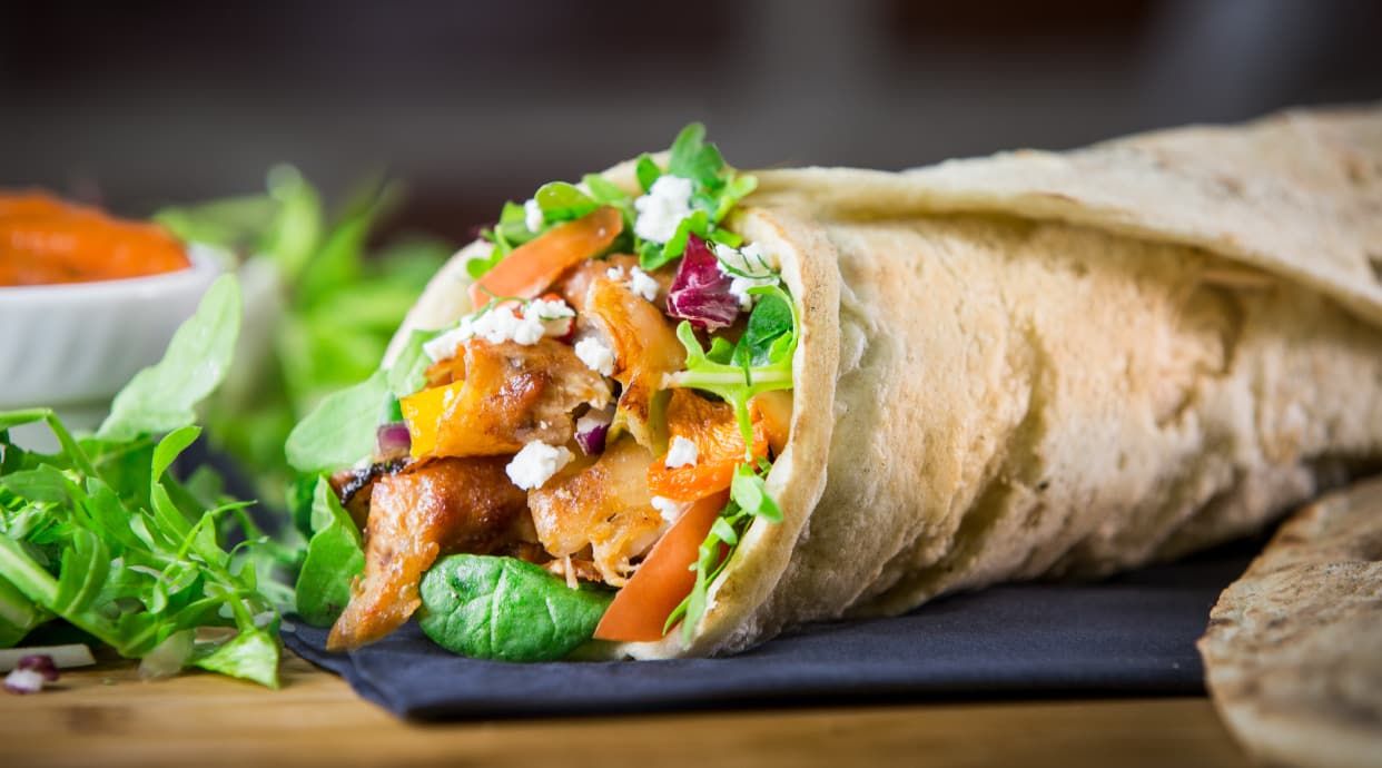 Carne de ternera o pollo enrollada en pan de pita con ensalada y salsas