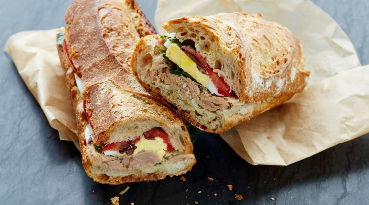 Sanguis de jamón York, queso, lechuga, tomate, huevo y atún con mayonesa