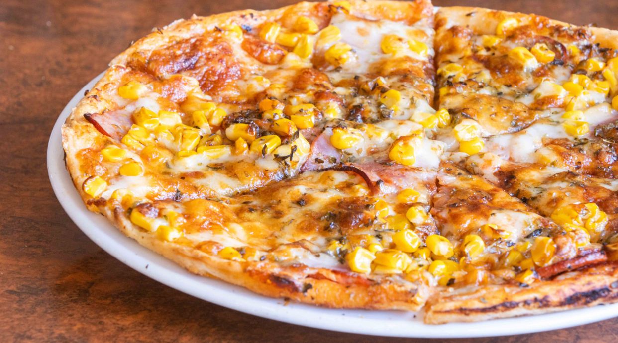 Tomate, Pepperoni, bacon, maiz, queso y orégano