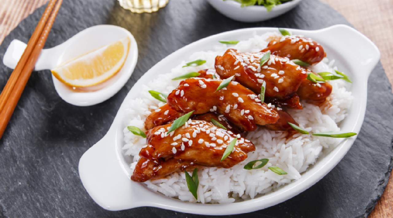 Pollo salteado al wok al estilo thailandés, con jengibre, pimientos y sofritos. Acompañado de ración de arroz jazmín.