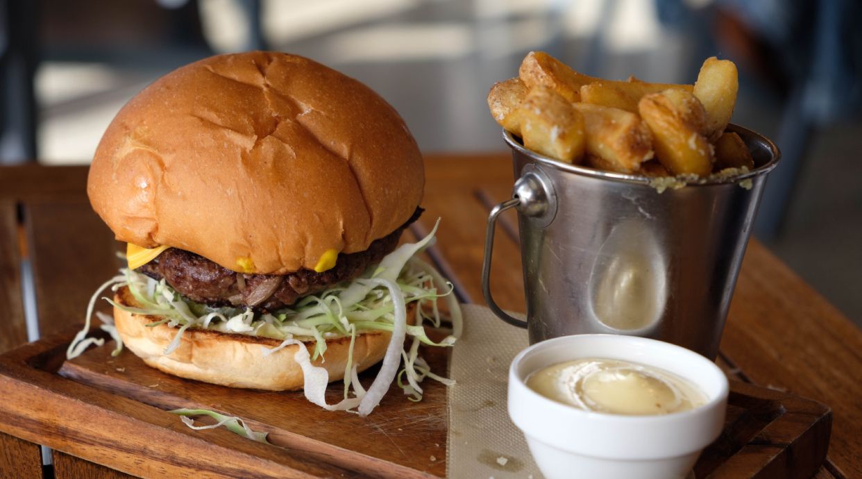 Hamburguesa de chuleton, cebolla calamelizada, tomate, lechuga, mayonesa, bacon, queso y huevo