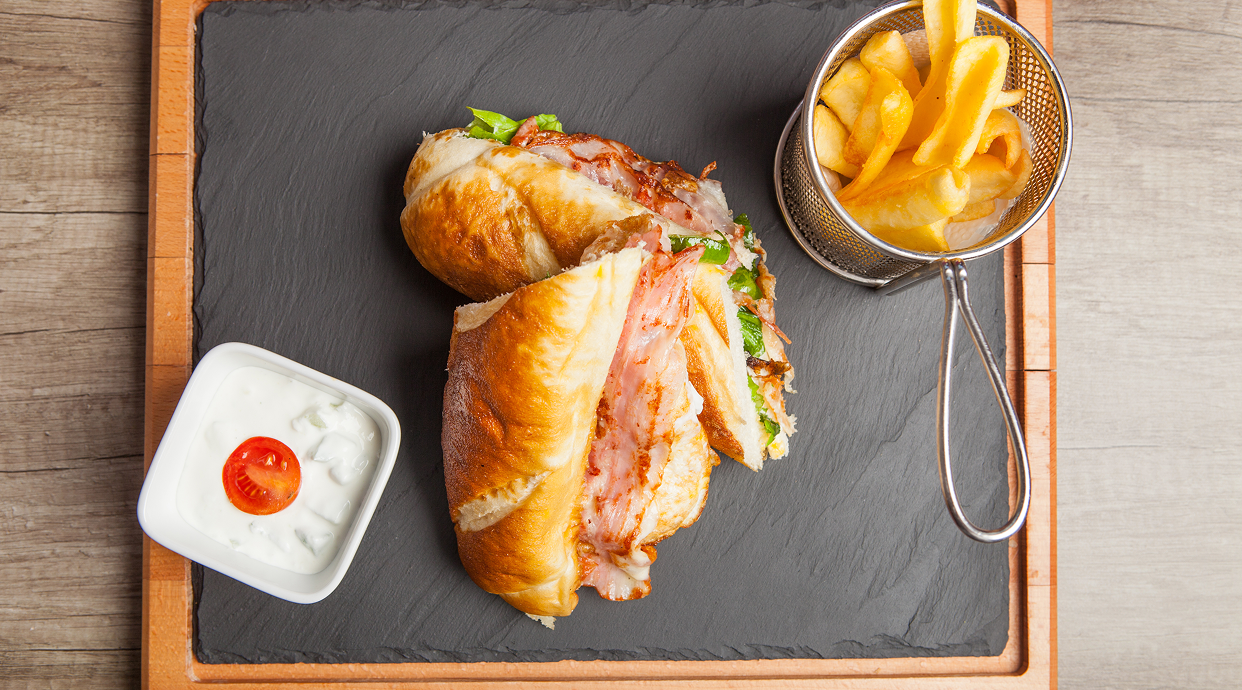 Salsa barbacoa, chuletón (200 g.), cebolla caramelizada, lechuga, tomate, bacon, queso y acompañado de patatas fritas