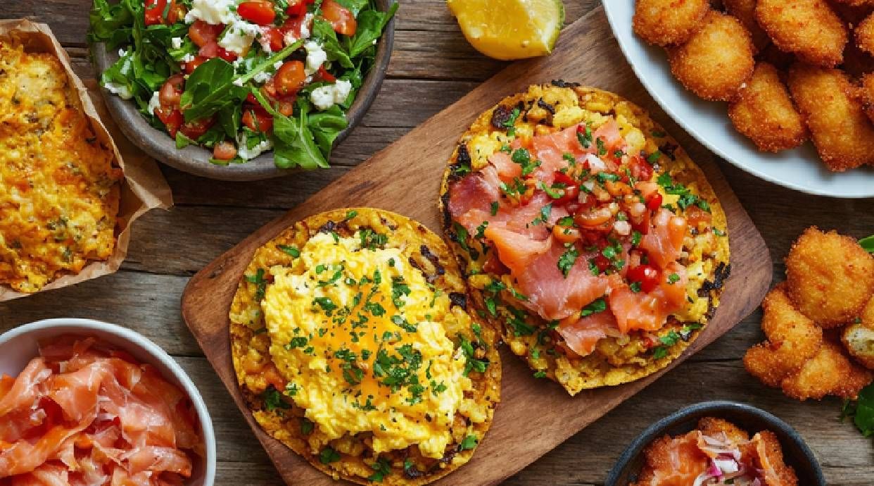 Lechuga variada, tomate, huevo, espárragos, atún y cebolla frita y vinagreta de frutos rojos