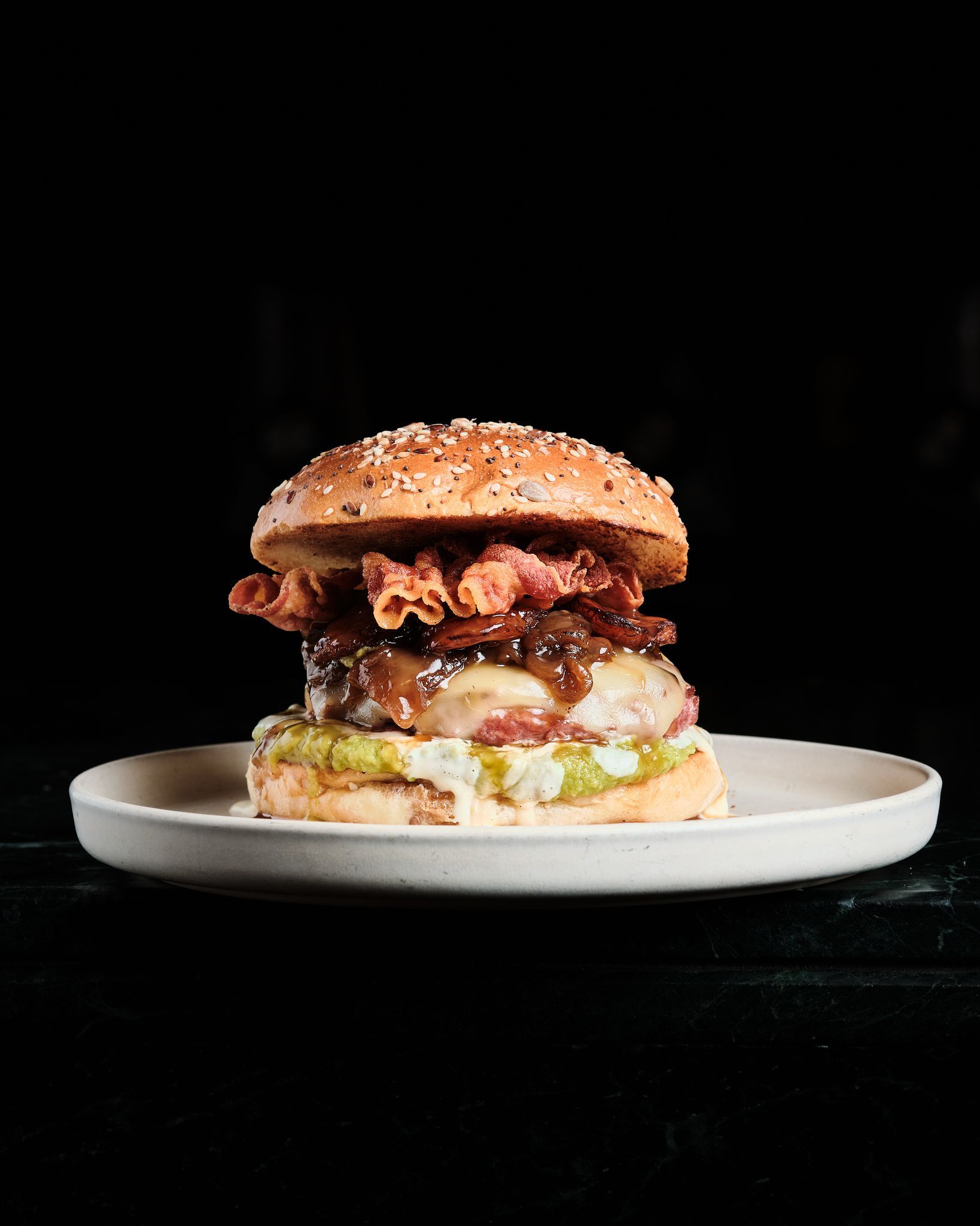 MOZZARELLA, MAYONESA DE HUEVO FRITO, PIMIENTO VERDE CONFITADO, HAMBURGUESA DE VACUNO, QUESO CURADO, TORREZNOS Y SALSA DE COÑAC Y MEMBRILLO