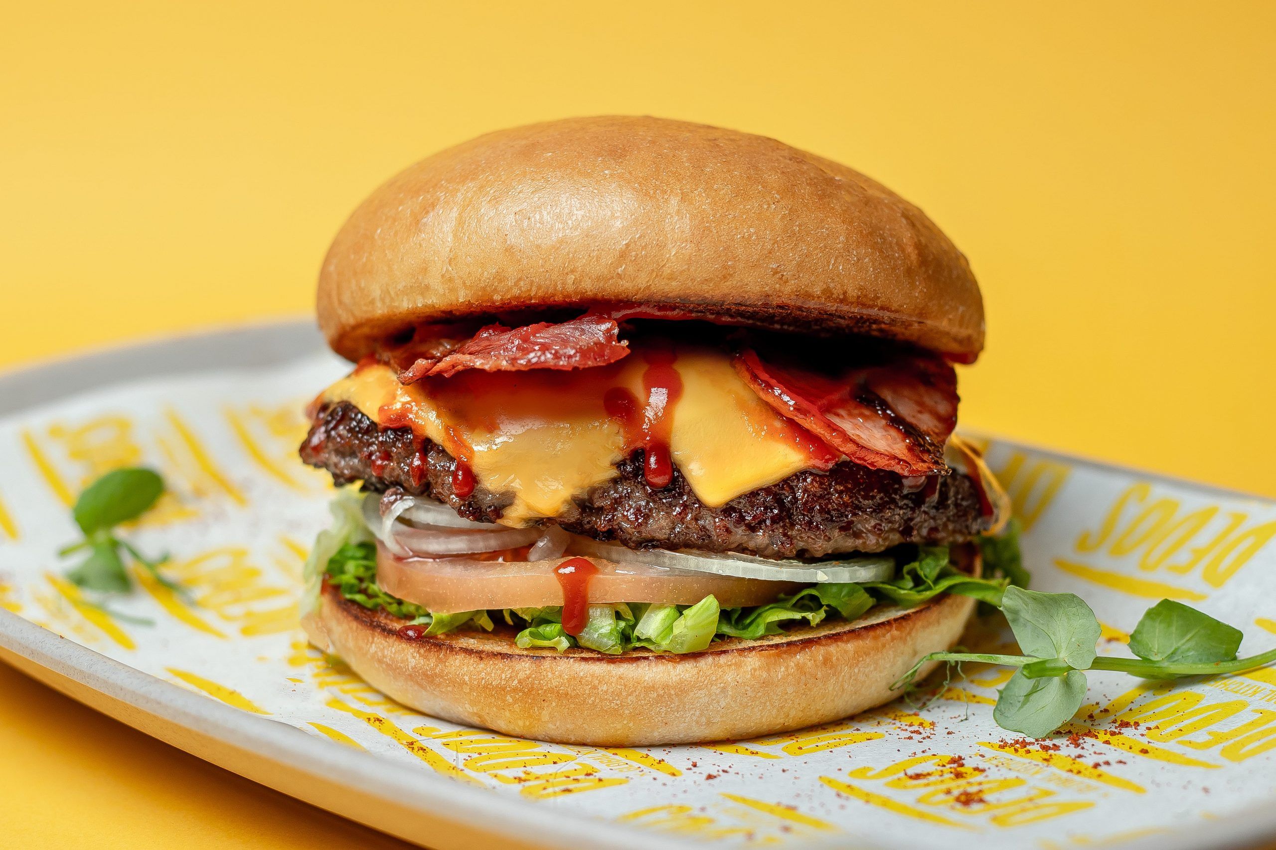 (180 g.) De carne de ternera, tomate, lechuga, queso, bacon y mayonesa