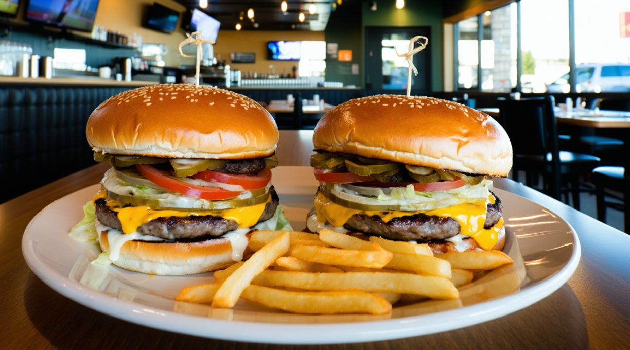 Pan brioche, hamburguesa de chuletón (180 g.), cebolla a la plancha, queso, pepinillo y salsa secreta. Acompañada de patatas fritas caseras