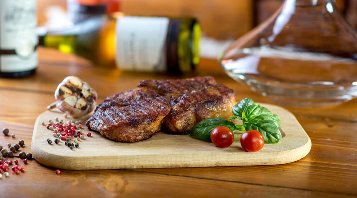 Entrecot con patatas, pimientos de piquillo y salsa txampi o roquefort