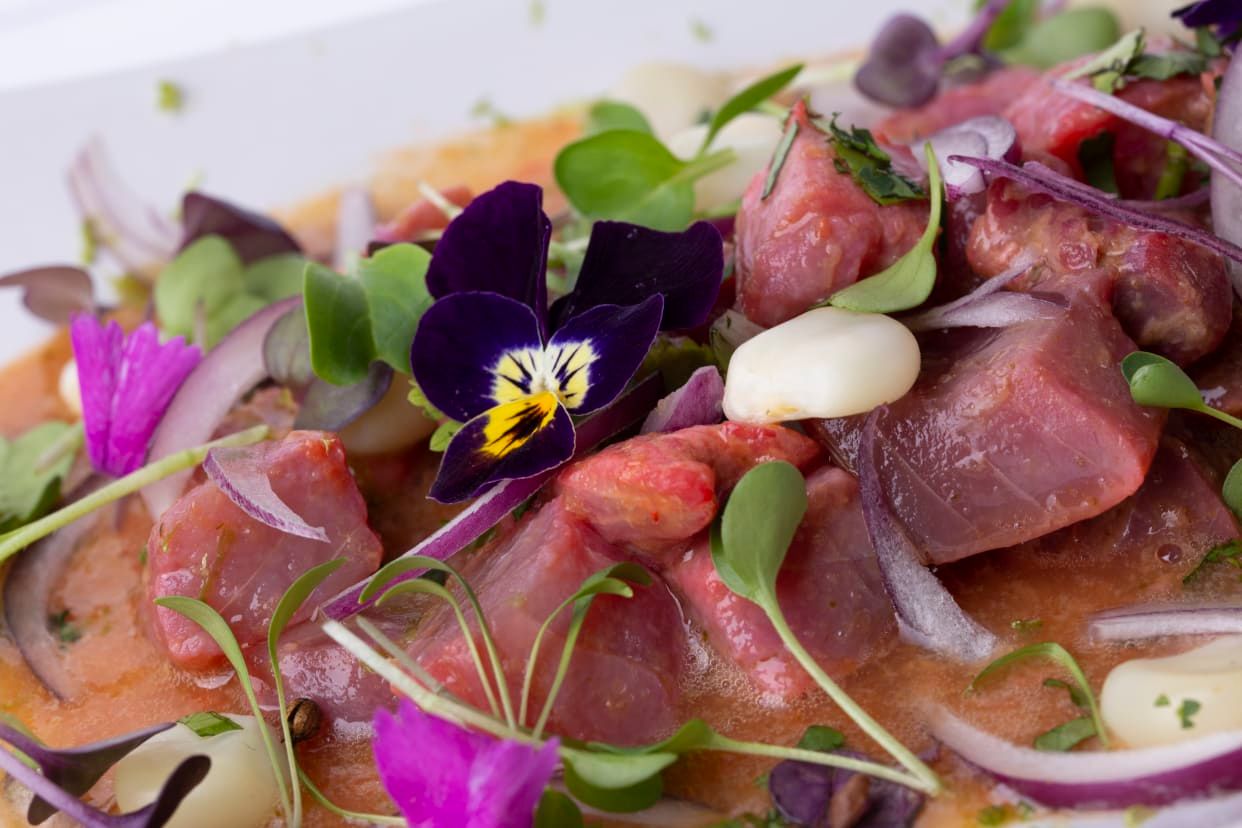 Rubia Gallega con totopos y variado de salsas mexicanas