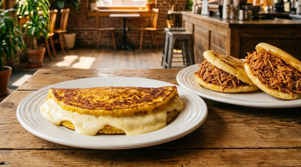 Arepa rellena de perico, un revuelto de huevos con cebolla y tomate