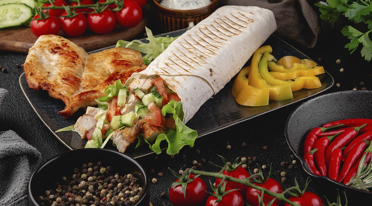 Tortilla de trigo rellena con carne de ternera, pollo o mezcla, con verduras y salsa, enrollada estilo kebab