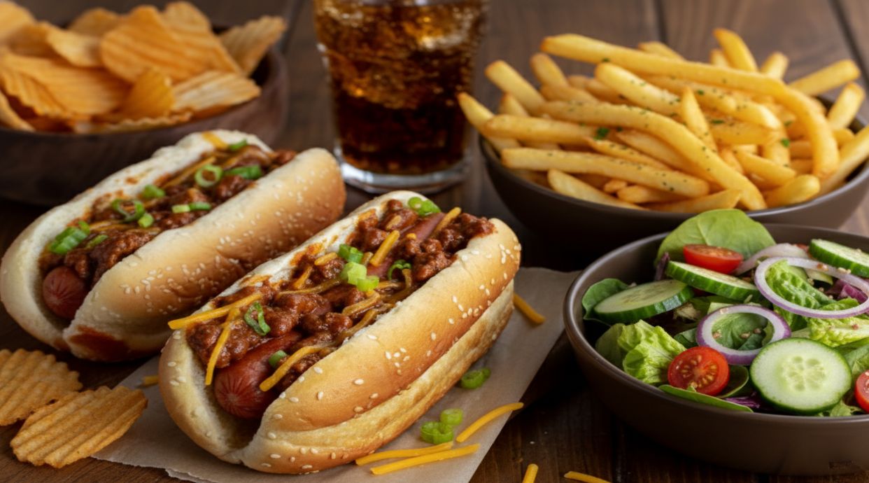 Salchicha bratwurst, ketchup, mostaza y cebolla crujiente.