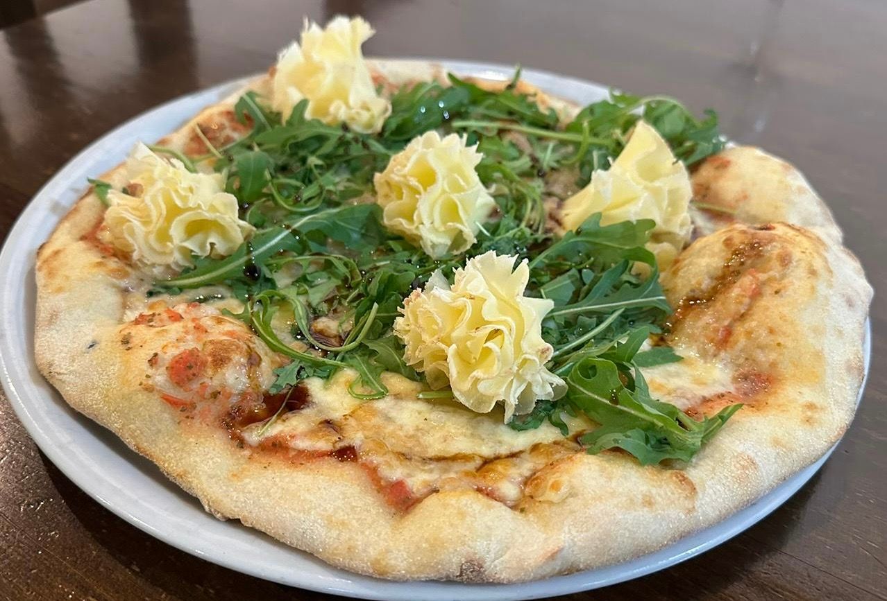 tomate, mozzarella, jamón de pato, cebolla caramelizada, tomate cherry, rúcula, parmesano y balsámico