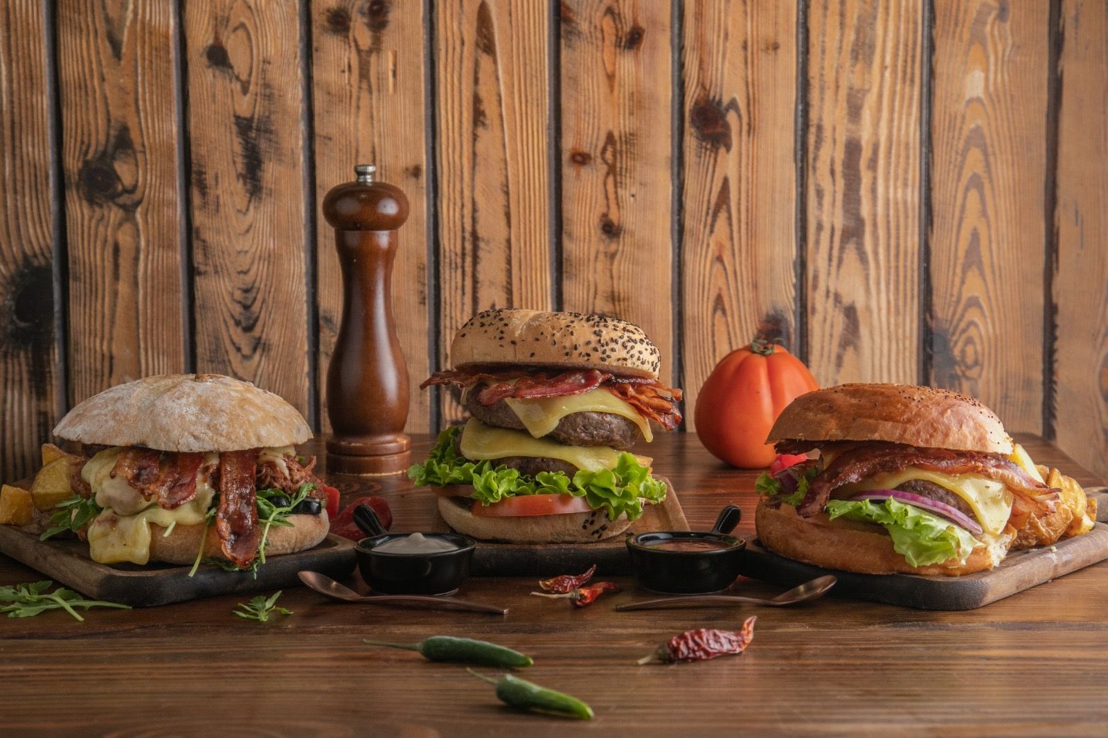 2 hamburguesas de ternera (150 g.), queso cheddar, bacon, lechuga y tomate