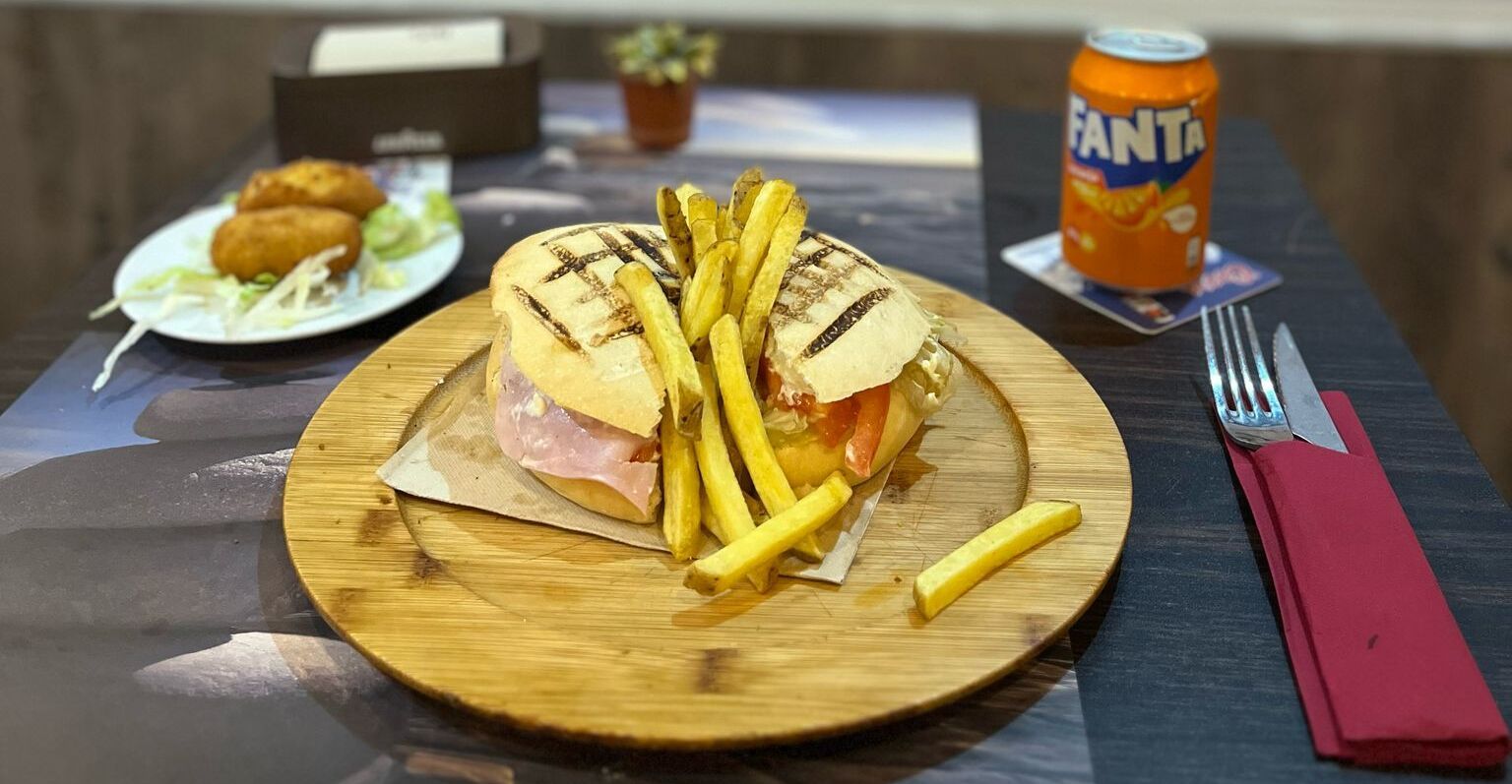 Pan de campero, mayonesa, lechuga,tomate, cebolla confitada,queso mozarela ,jamón York ,Carne mechada de prensa ibérica y patatas fritas naturales.