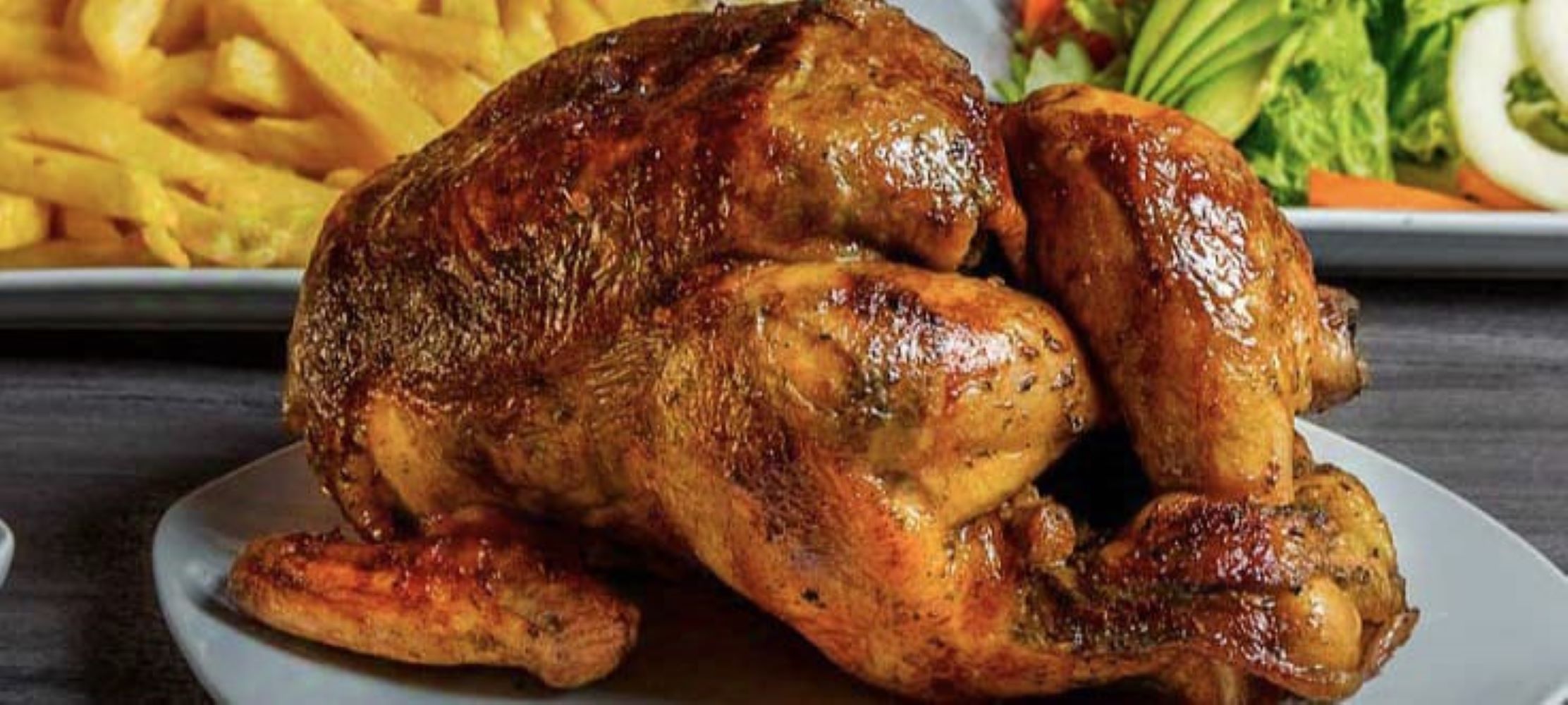 1 pollo a la brasa con patatas y ensaladas y sus cremas