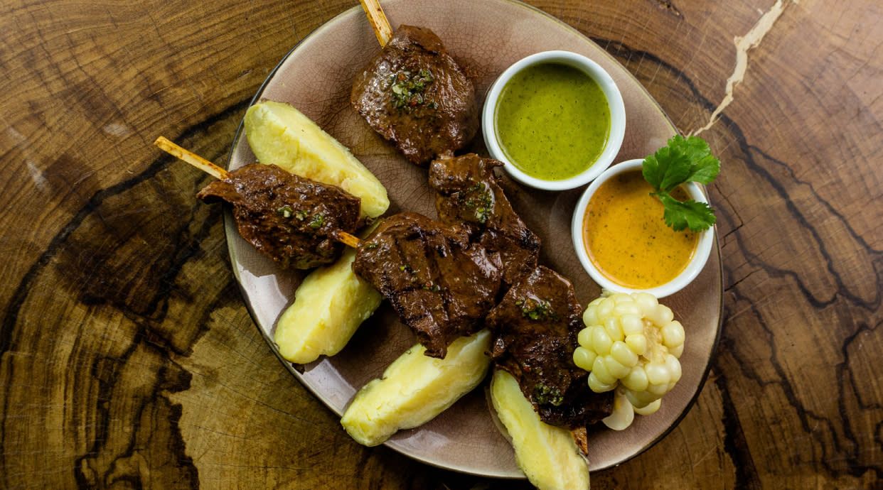 Brochetas de anticucho, rachi y mollejas marinadas al estilo del chef