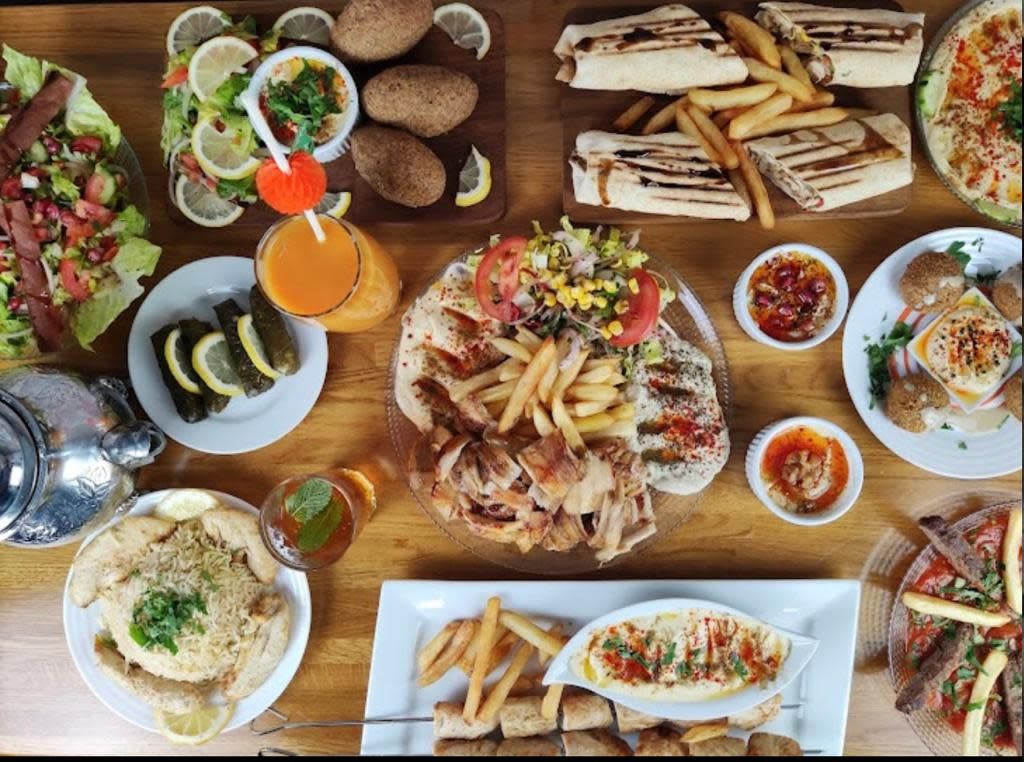 Falafel, Kebba, Warak Eneb, hummus, moutabal de berenjena, patatas y ensalada. Acompañado de pan sirio