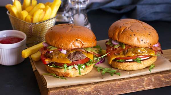 Dos Hamburguesas 100% vacuno Km 0, en pan Juanito Baker, salsa Barbacoa, cheddar, bacon y cebolla caramelizada