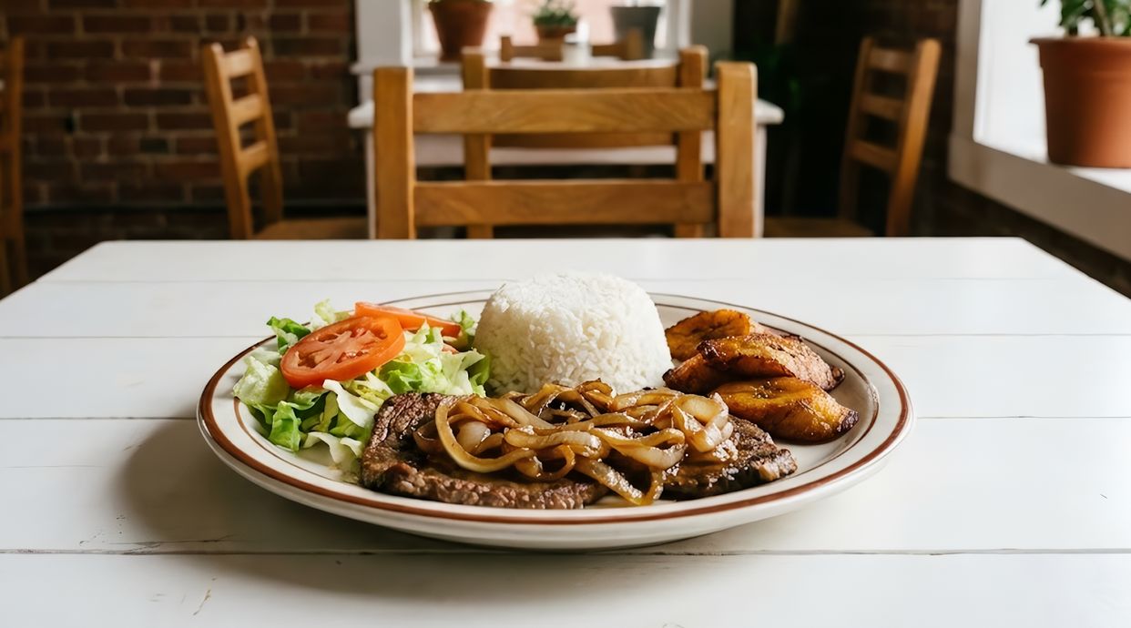 Carne asada con gallo pinto, tajadas de plátano verde y ensalada
