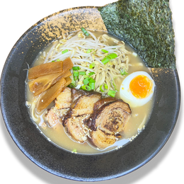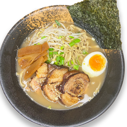 Fideos ramen con caldo de pollo, cerdo y salsa de miso, huevo escalfado, chashu, brotes de soja, bambú guisado, alga nori y cebolleta