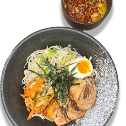 Fideos ramen con huevo escalfado, chashu, kimchi, cebolletas, alga nori y brotes de soja, comer mojando en un caldo con base de salsa de soja, salsa de sésamo y picante