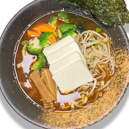 Fideos ramen con sopa de miso, tofu fresco, brotes de soja, bambú guisado, cebolla, brócoli y zanahoria