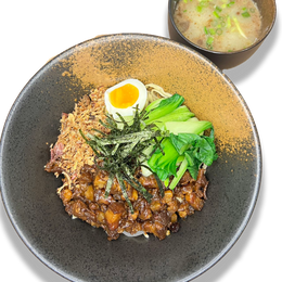 Fideos ramen con pollo frito, huevo escalfado, brotes de soja, cebolla frita y alganori, comer mojando en un caldo con base de salsa de soja, salsa de miso y aceite de cebollino