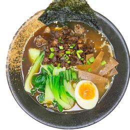 Fideos ramen con caldo de pollo, cerdo y salsa de curry, huevo escalfado, chashu, bambú guisado, alga nori, pak choi y cebolleta