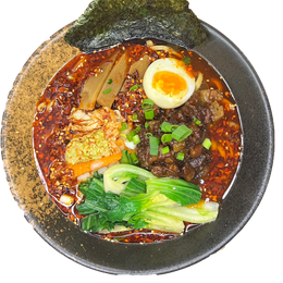 Fideos ramen con caldo de pollo y cerdo con salsa de soja y picante, huevo escalfado, master panceta guisado, kimchi, bambú, pak choi, alga nori y cebolleta