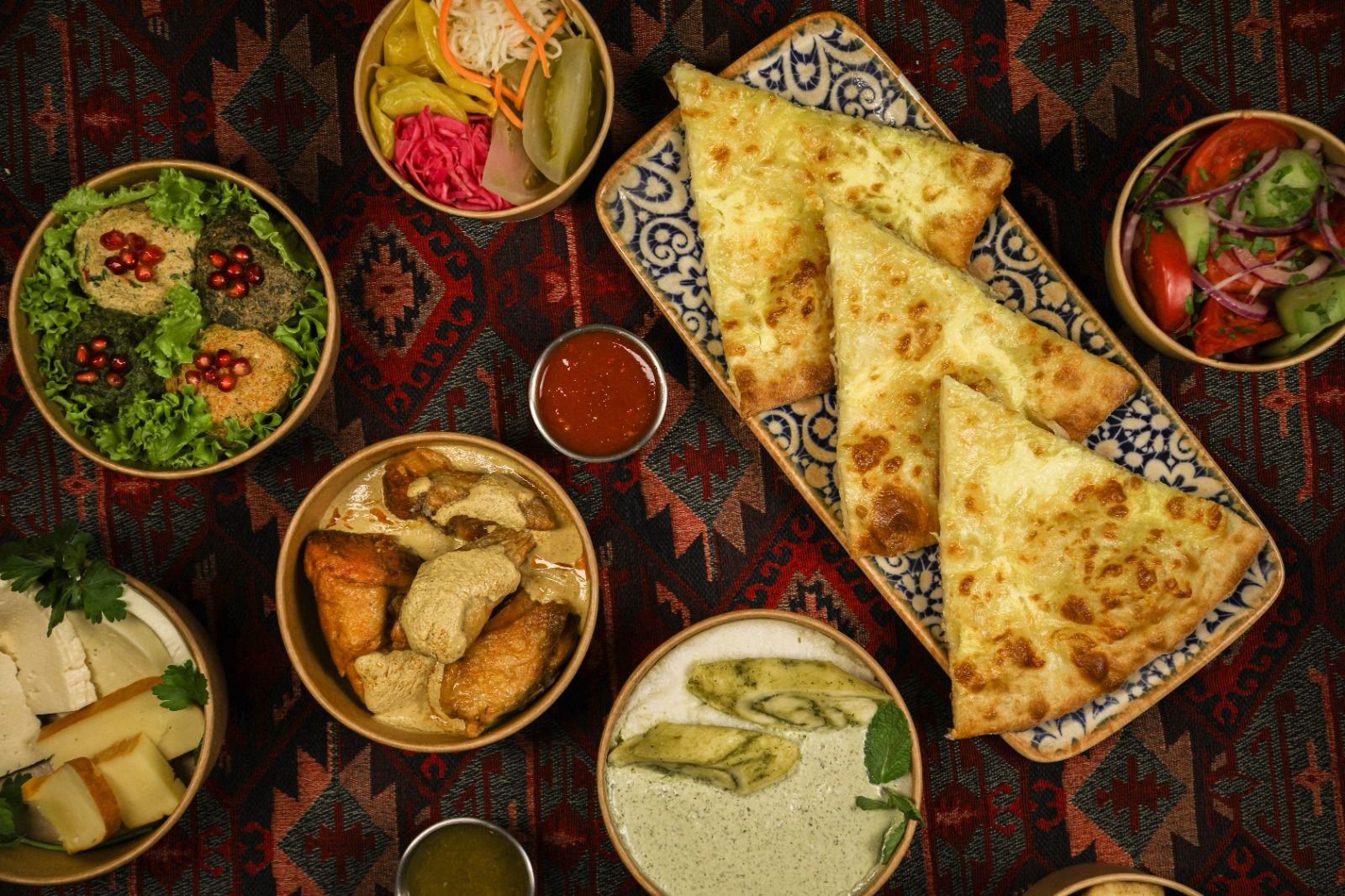 ფხალის ასორტი, კიტრიპომიდორი, მჭადი და სასმელი
