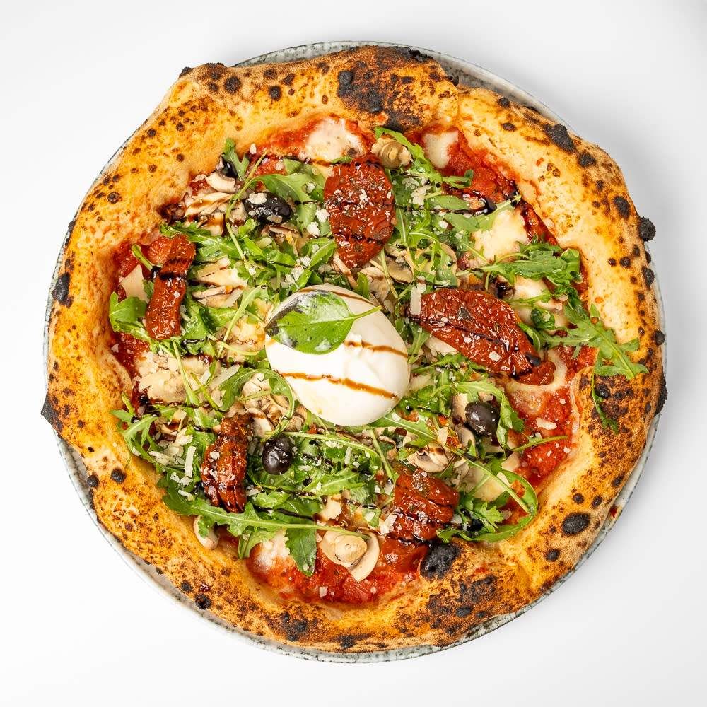 Pelat, mozzarella, šampinjoni, rikola, buratino, sušene rajčice, masline, tartufi mozzarellina, svježi bosiljak, aceto crema, grana padano