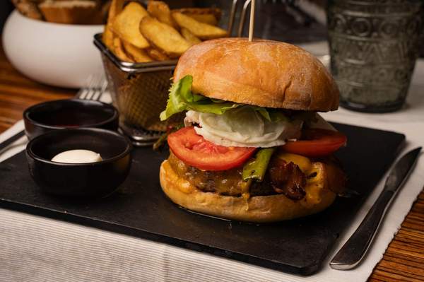 200 gr fassona, cheddar cheese, crispy bacon, BBQ sauce, insalata, pomodoro