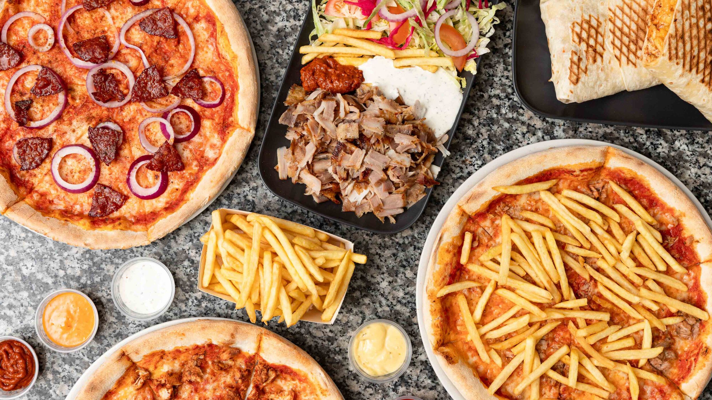 Pomodoro, mozzarella, carne di kebab, insalata, pomodoro fresco, cipolle, salsa piccante, salsa bianca