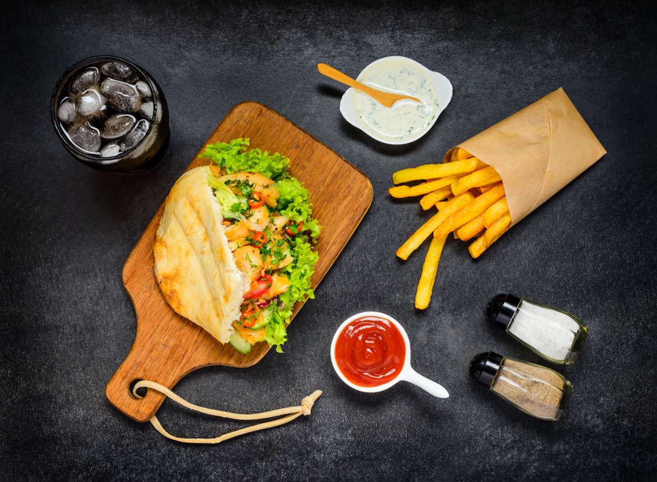 Panino kebab, patatine fritte, Coca Cola in lattina