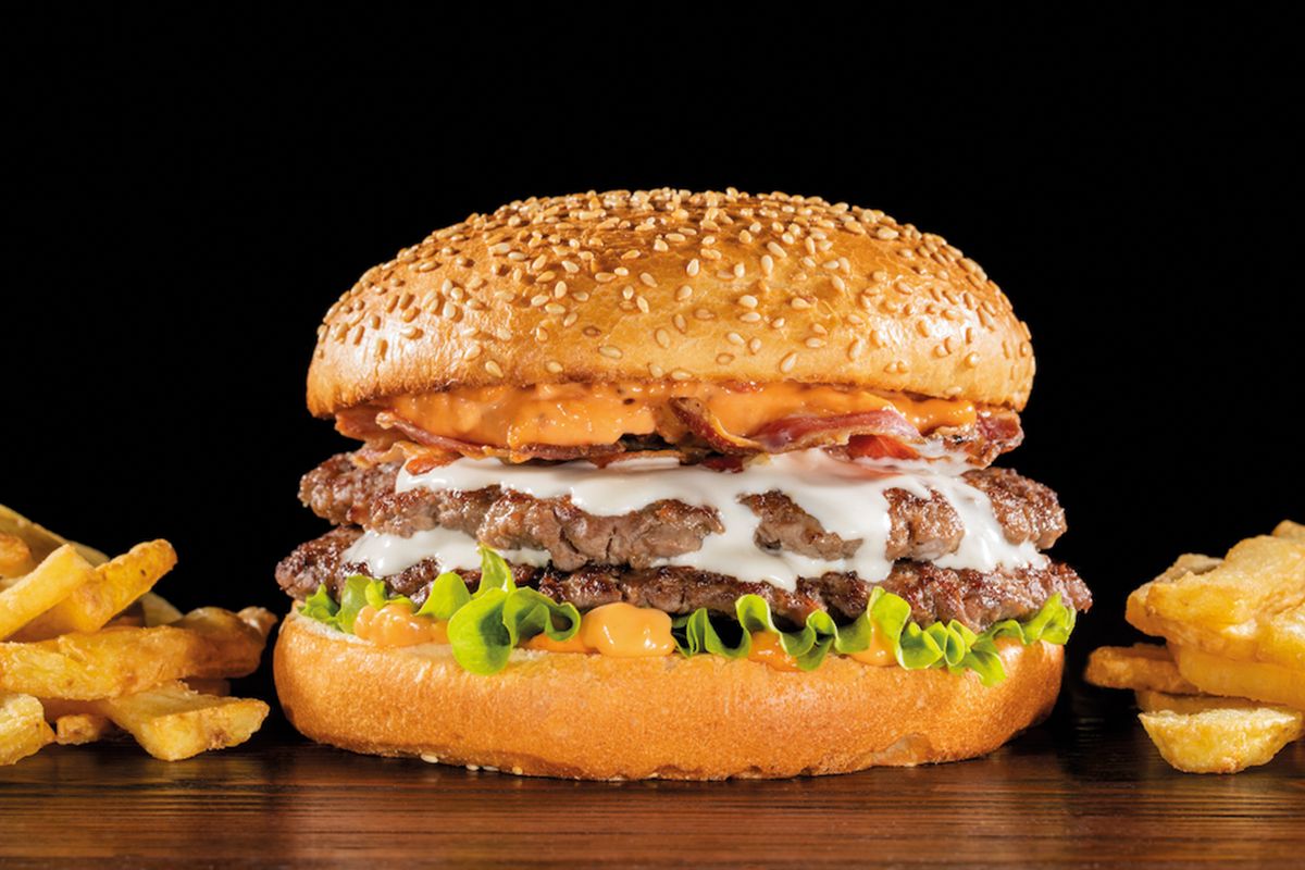 Panino*, doppio hamburger*, doppio formaggio fuso, doppio bacon, servito con cipolla rossa, patate* Fries e salsa OWW