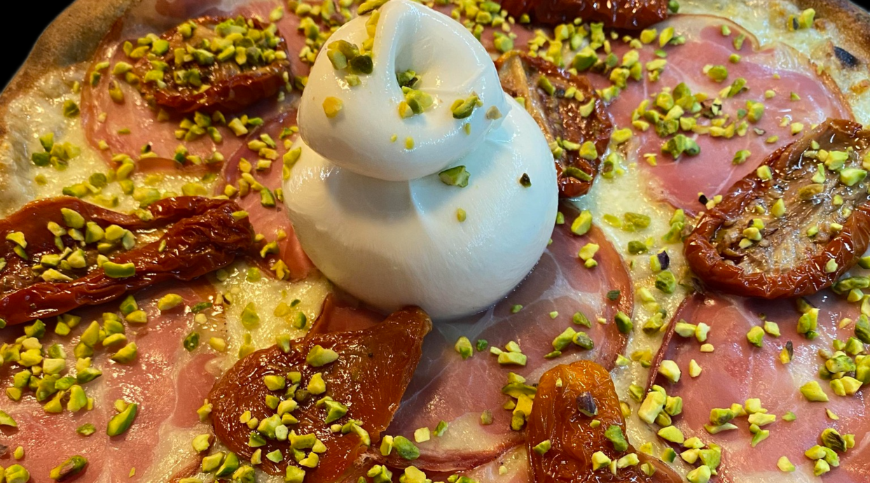 Salsa di pomodoro, mozzarella, zucchine, prosciutto crudo, stracciatella e rucola