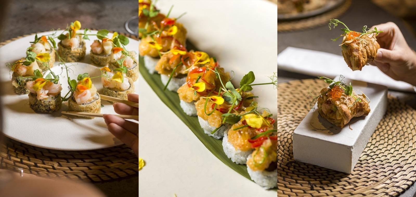Gambero in tempura, avocado, melanzana fritta, cover di salmone affumicato e philadelphia
