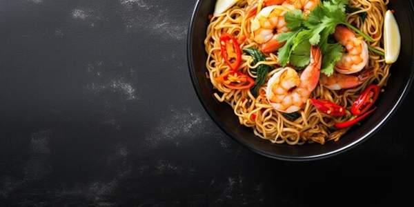 Spaghetti di riso, uova, germogli di soia, zucchine, carote, gamberi