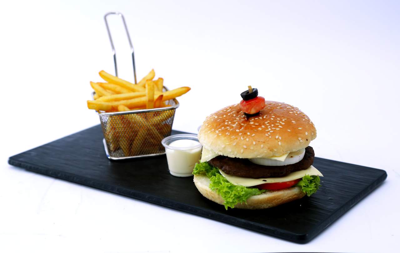 Hamburger, pomodoro, cipolla, cetriolini, cheddar, patatine fritte