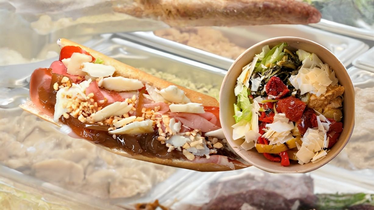 Mortadella al pistacchio, cheddar, hummus di ceci, insalata, pomodori secchi, BBQ BIBITA IN OMAGGIO