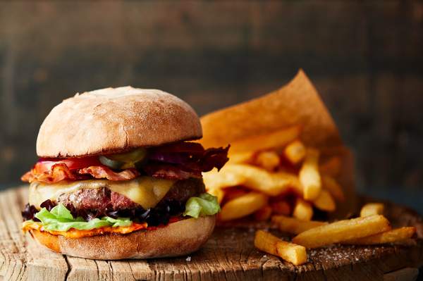 Burghero di manzo, anelli di cipolla pastellati e fritti, pancetta croccante, miele affumicato al pepe nero, scamorza vaccina, spinaci al vapore, maionese