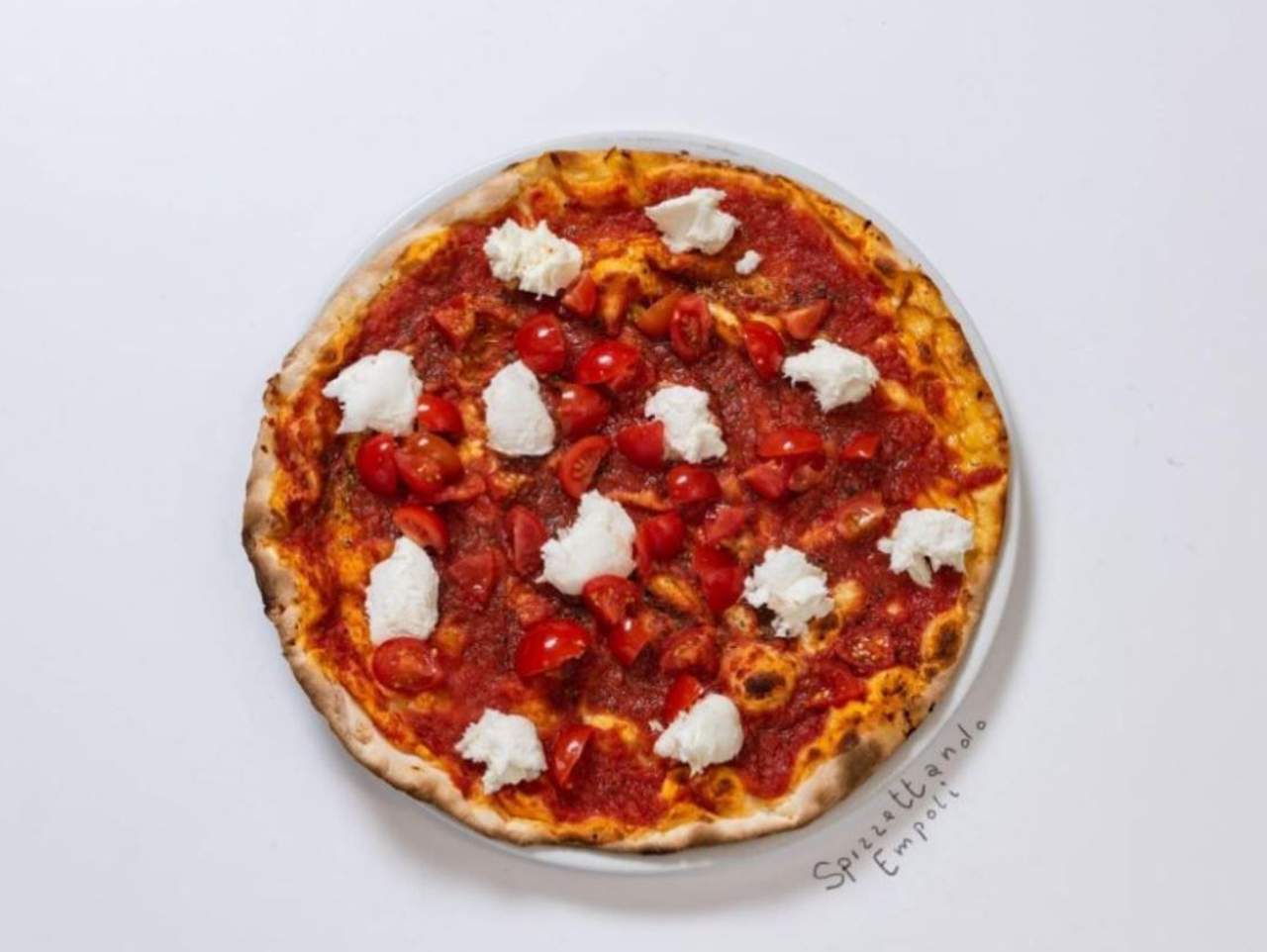 Pomodoro, aglio, origano; dopo a crudo: mozzarella di bufala e pomodorini