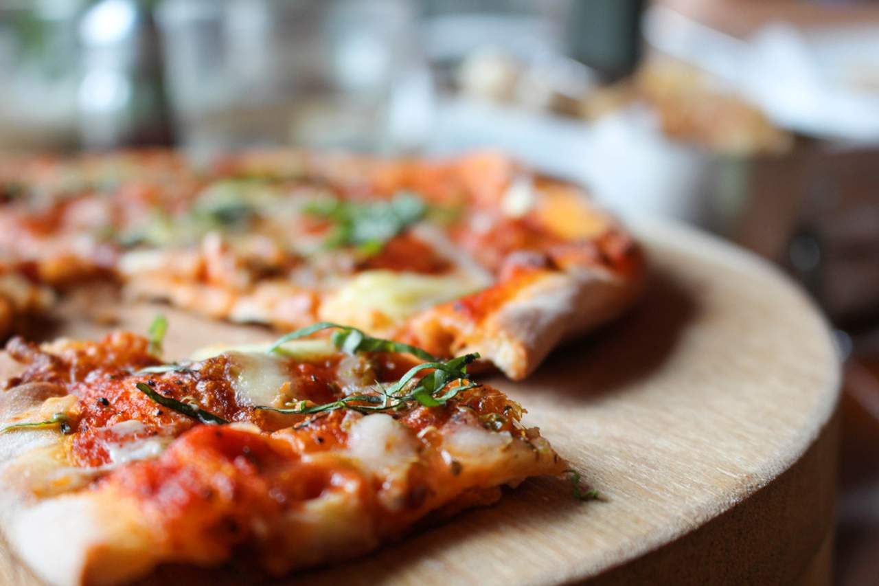 Pizza con pomodoro, mozzarella, salame piccante, olive taggiasche, n’duja e olio al peperoncino