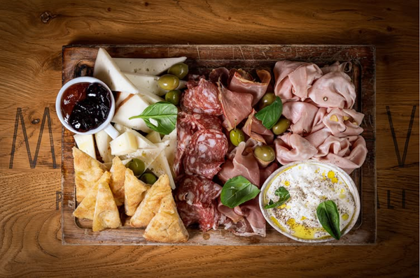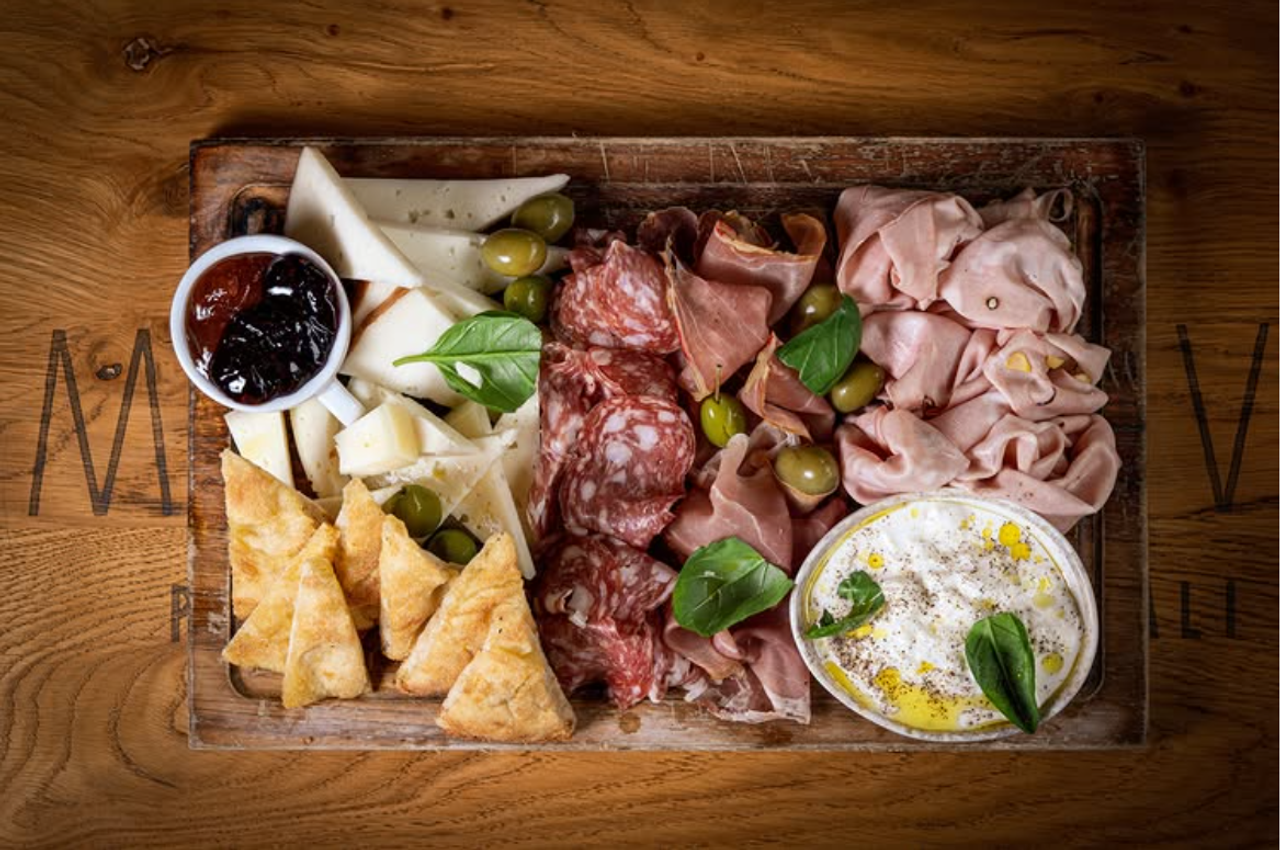 Salumi della tradizione accompagnati con formaggi del territorio marmellatine artigianali, pinsa croccante e olive verdi