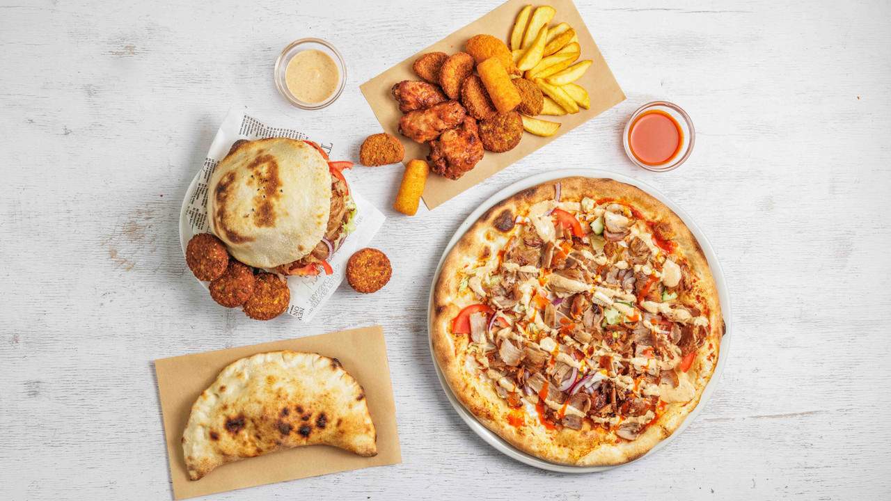 pizza con carne di kebab, verdure fresche e salse a tua scelta.